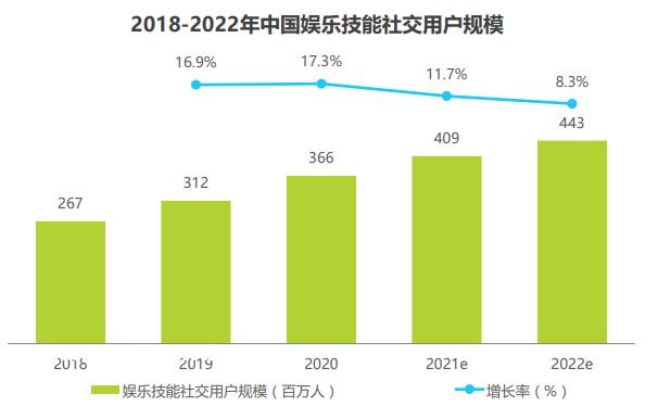 新冠**影响下,人们将**的重心转移到线上,打游戏、看**、游戏陪练、语音**等成为众多用户****及**社交的选择。在此影响下,**技能社交行业用户规模在2020年有较为明显的增长,整体用户规模达到3.7亿人,同比增长17.3%。在未来,随着用户**需求及社交需求的提升,游戏用户将持续向游戏**用户及游戏陪练用户转化,语音技能服务也将吸引更多年轻人参与,带动**技能社交用户的进一步扩散。