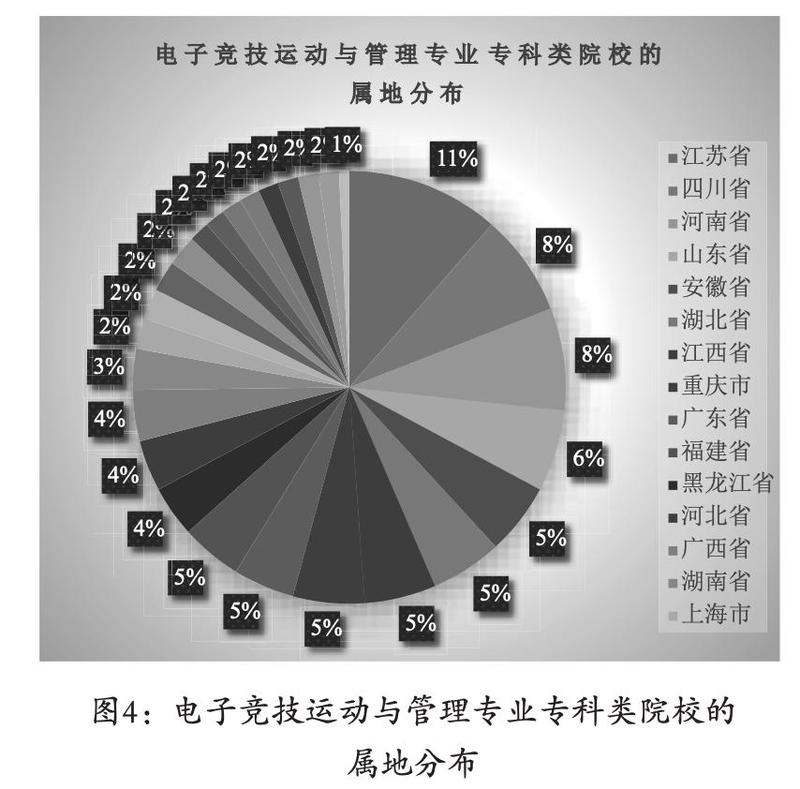 截至2020年,开设本科类电竞专业或方向的有中国**大学数字媒体艺术(数字**方向)、中国**大学南广学院艺术与科技(电子竞技分析方向)、北京吉利学院电子竞技运动与管理专业、上海体育学院播音与主持艺术(电子竞技解说方向)、上海戏剧学院电子竞技主持解说专业和山东体育学院电子竞技运动与管理专业,开设电子竞技运动与管理专业的专科类院校有131所,开设专业方向139个,除、宁夏、青海、甘肃、**、香港和**外,分布在27个省、自治区和直辖市之中(图4)。