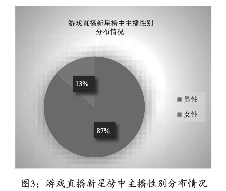 腾讯游戏“游戏**影响力榜和新星榜”显示,虎牙、**、**电竞三家游戏**头部企业各自***20榜单中,女***主播仅有一人上榜,占比为2%(图2);在新星榜方面,三家游戏**头部企业***10榜单里,只有4位新锐女主播上榜,占比为13%(图3)。游戏**主播的男女比例接近9∶1,可以进一步佐证游戏**主播男多女少现象[15]。