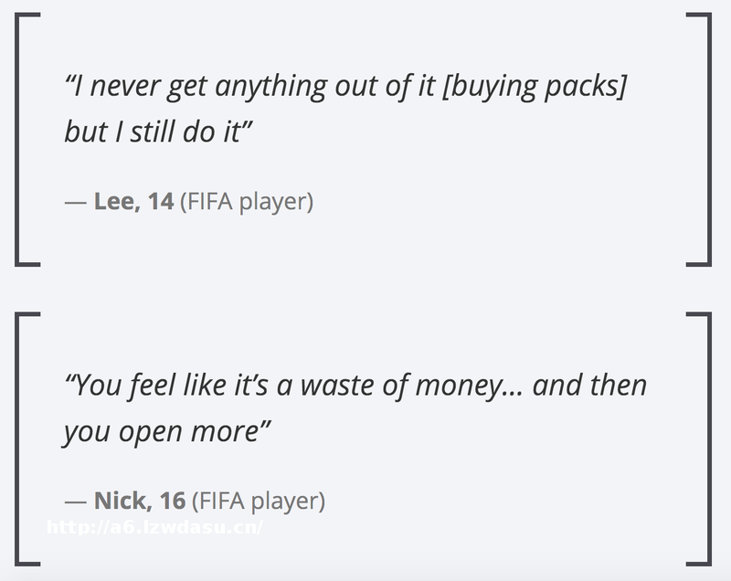 2019年9月,英格兰儿童委员会(The Children’s Commissioner for England)发布了对谈10至16岁未成年人的报告,通过对谈了解游戏对他们的影响。报告专门有一节为《Gaming and Gambling》(游戏与),报告显示,儿童在游戏上的支出金额逐年增加,游戏的设计也鼓励消费,比如战利品箱。“这就像一样,你花了钱,可能得不到好东西,也可能获得特别好的。”16岁的FIFA玩家Tim说。