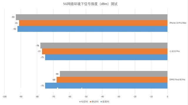 在5G速率测试之后进行的是信号强度测试,测试环境同5G速率测试一样在同一空间点位进行,dBm一般为负数,信号参数的***越小信号越好。在该项测试中OPPO Find X5 Pro的表现具有明显优势。
