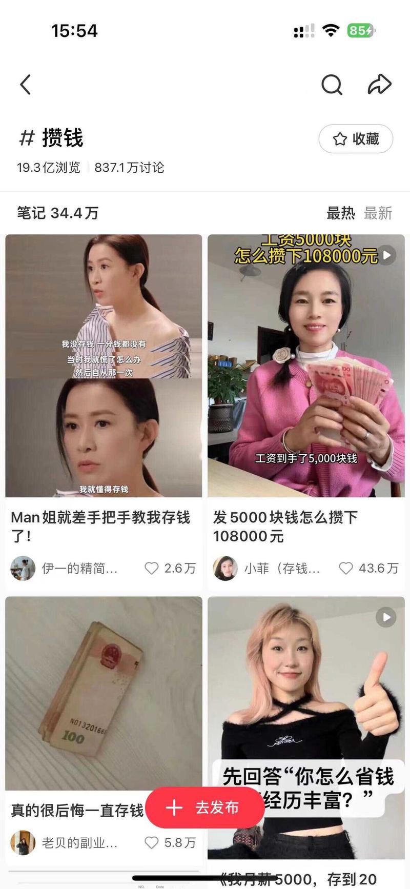 如果不信,你去小红书上搜一下#攒钱就会理解它的声量。截止到现在,已经积累了19.3亿阅读、837.1万条讨论笔记。
