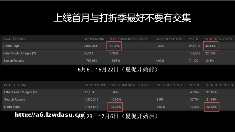 这张PPT解释了为什么刚才我说我们选择了错误的发行时机。我们游戏上线两周就开始夏促,夏促时首页没有轮播大图,只有下面很小的栏位,里面会有4-5个游戏,而且很不容易被发现。上面这张图是我们上线头两周的曝光状况,首页展示占比70%;后两周夏促开始之后只有不到40%,而且首页没有了,其他和首页联动的曝光量也随之减少。下图只有100万次,数量将近8:1。
