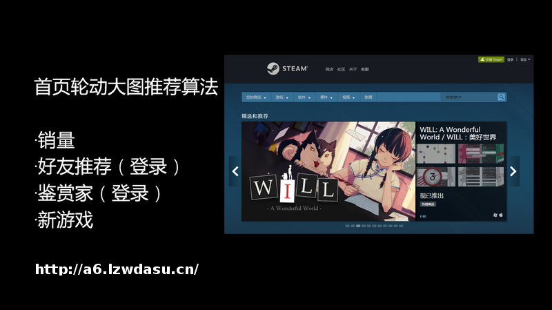 这个是Steam的首页轮动大图,这也是曝光量非常大的位置。它有一些算法:如果用户没登录Steam账号,那这一栏的游戏主要取决于游戏的销量和是否为新游戏;如果用户登录了,首页大图的曝光量非常高,那些主播所做的安利会对这一点产生很大助益。头两周里,首页游戏的展示占我们全部展示的70%。