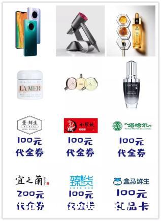 此外,华为MATE30手机、戴森吹风机、海蓝之谜面霜、娇兰黄金复原蜜、香奈儿邂逅系列香水、兰蔻小黑瓶精华肌底液、Dior口红、盒马鲜生礼品卡、各类餐饮百元无门槛礼券等……所有奖品总价值达到百万级别,诚意满满,就等你了!