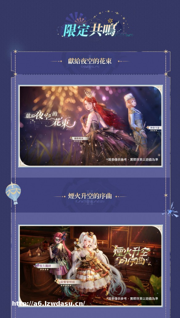 开放世界换装冒险游戏《无限暖暖》推出了1.2版本“花焰季”,这次更新包含了全新的活动岛“花焰群岛”、新场景“朝岁节”和热气球路线“俯瞰日”等内容。同时,还推出了全新的限定共鸣套装,玩家可以通过共鸣活动“献给夜空的花束”获得5星限定能力套装【绣夜希光】和4星限定能力套装【仲夜守望】;通过活动“烟火升空的序曲”获得5星套装【绽响黎明前】和4星套装【恒久羁绊】。