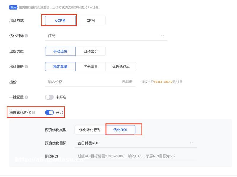 搭建流程其实也很简单,优化目标选择“注册”,深度转化优化类型中选择“优化ROI”,填入期望的ROI值。