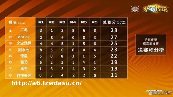 纵观比赛,帕奇斯的成绩相对稳定,拿到帕奇斯的选手大部分都收获了不错的积分;凯尔萨斯虽然相对弱势,可拿到两次凯尔萨斯的甜水七使用其斩获11分,可见选手的操作和牌运也尤为重要。前三*仅仅获得6分的二毛后来居上,在后三*比赛中连吃两鸡并拿到一个第二,尤其最后一*的吃鸡更是助其以1分的微弱优势战胜dorick,获得了本次比赛的冠军,dorick则获得亚军。夕尘残枫和甜水七分列第三名和第四名,恭喜他们!