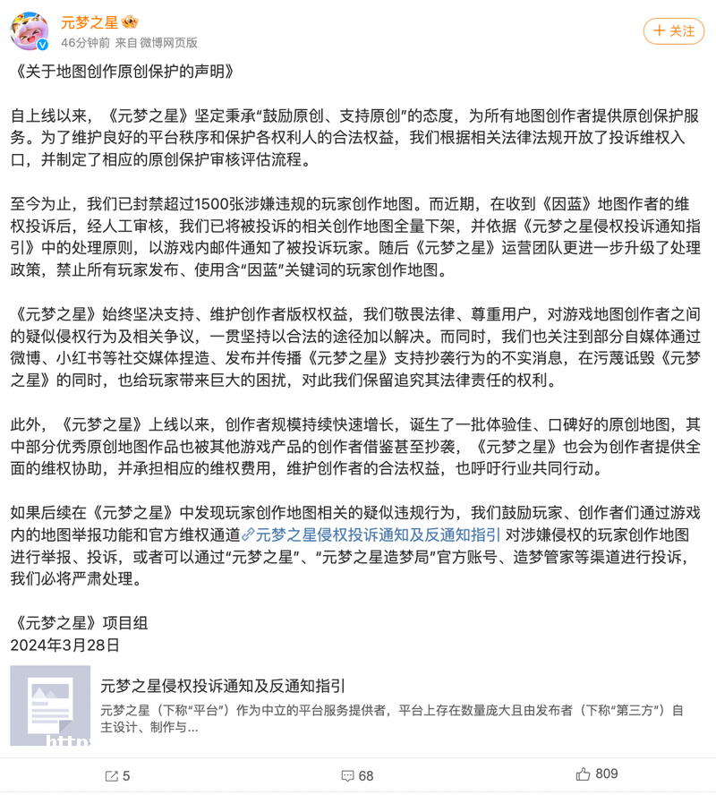 同日,近期,《元梦之星》已将被**的相关创作地图全量**,以游戏内邮件通知了被**玩家。随后《元梦之星》运营团队更进一步升级了处理政策,禁止所有玩家发布、使用含“因蓝”关键词的玩家创作地图。
