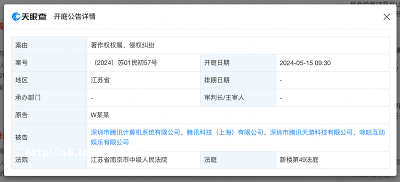 天眼查App显示,原告为W某某,被告包括深圳市腾讯计算机系统有限公司、腾讯科技(上海)有限公司、深圳市腾讯天游科技有限公司等4家公司,该案将于5月10日在江苏省南京市中级人民****审理。