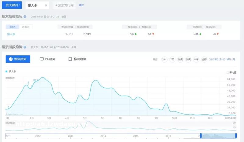 从百度指数来看,狼人杀在2017年元旦后爆发,回落后6月达到次高峰,并开始了连续半年的下降走势。