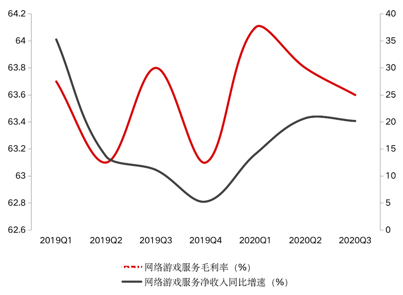 可以看到,今年第三季度该公司游戏服务净收入同比及环比均实现正增长。若将时间维度拉长来看,《**时报》研究员留意到,2019年**季度至2020年第三季度,该公司游戏服务净收入同比增速已由2019年**季度单季的35.26%下降至今年第三季度单季的20.18%,且其游戏服务净收入同比增速曾于2019年第四季度降至个位数。