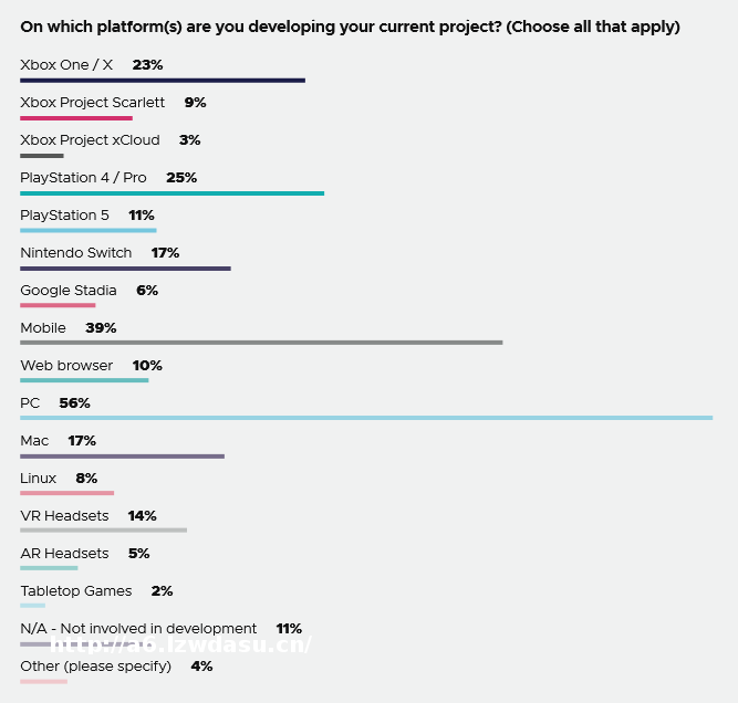 而在 GDC 2020 年的产业报告中,可以发现大多数开发者仍选择在 PC 平台上进行开发,其次便是手机端。