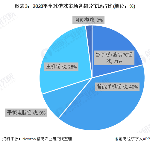 手机端游戏的收入占比已达 40%,其次是主机游戏和 PC 游戏。