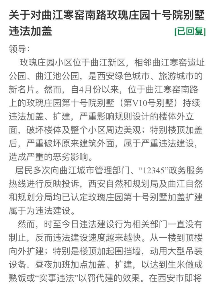 西安自然和规划*和曲江自然和规划分*均已认定玫瑰庄园第十号别墅加盖扩建属于违法建设。然而,别墅业主的违建行为一直没有停止。