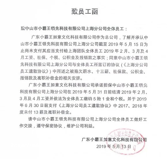 好景不长,2019年6月,成立不到三年的上海小霸王游戏机**团队解散。吴松透露,在项目运行期间,益华控股并没有按照原定计划对项目予以**支持。9月时,由广东小霸王如意文化科技有限公司发布的《致员工函》被曝光,其中表明,2月至2月间,小霸王曾拖欠员工工资与供应商款项,直到团队解散仍未偿清。