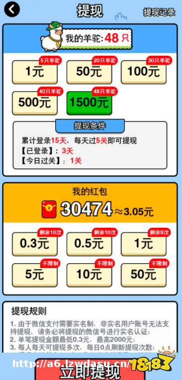 真的能*钱。登录这款游戏之后,过1关就能马上获得一个0.3元的奖励,这个游戏有两种奖励,一个是红包奖励,另外一个是羊驼奖励,每过一关获得一个羊驼。红包和羊驼都有对应的提**额,但是除了小额几毛钱的可以提到账之外,其他的金额的提现都有很多特别困难的条件,