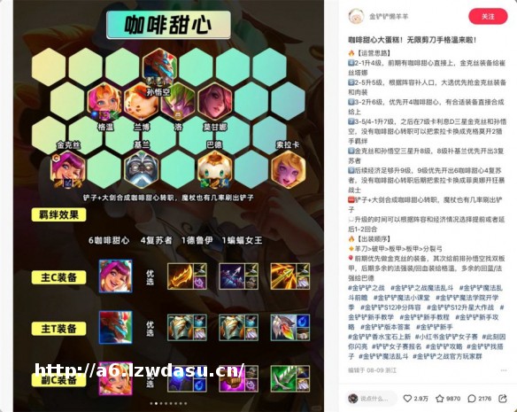 再以金铲铲为例,作为一个强攻略类型的游戏,随着赛季版本的更新,其英雄强度也会产生变化,这个时候玩家对阵容搭配等游戏攻略的需求就相当大。而在小红书上,不仅有强势英雄的阵容推荐,还有专门针对女*玩家偏好创作的游戏攻略。比如S12咖啡甜心推出后受到不少女*玩家喜爱,如何利用这一羁绊叠出两千层大蛋糕获得奖励就成了小红书上的热门内容。