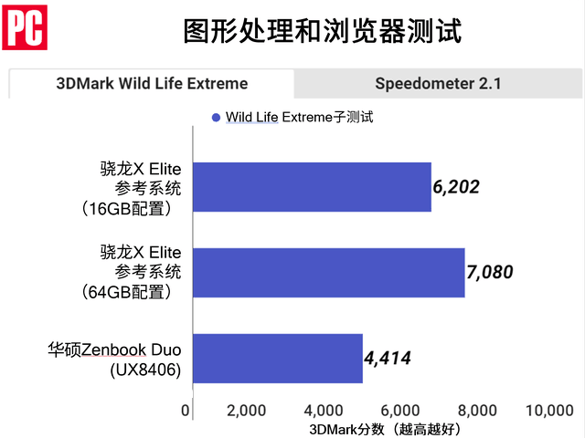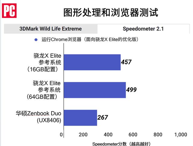 让我们从图形处理开始。在骁龙X Elite首轮测试中,我们看到了3DMarkWild Life Extreme测试结果。下面是这两款最新参考设计和采用英特尔锐炫IGP的酷睿Ultra7 155(ZenbookDuo)的对比。注:我们还列出了浏览器测试结果(与IGP*能无关)。