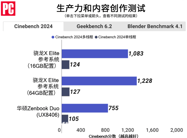 我们在多核和单线程设置中运行了最新版Cinebench。即使主频较低的骁龙X Elite在单线程测试中也比ZenbookDuo快约20%,而且在多线程测试中更快一些。更有趣的是,主频更高的64GB配置比16GB配置多线程*能提升近20%。本身可能体现为更低的工作温度,可能让芯片全力以峰值速度运行更长时间后才出现节流。