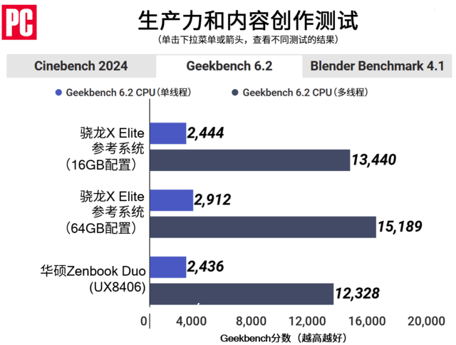 尽管两款骁龙X Elite配置在多线程测试中仍然名列前茅,但在Geekbench6.2测试显示的动态*能表现不太瞩目。在单线程*能测试中,ZenbookDuo表现出色,与较低的骁龙X Elite配置旗鼓相当。
