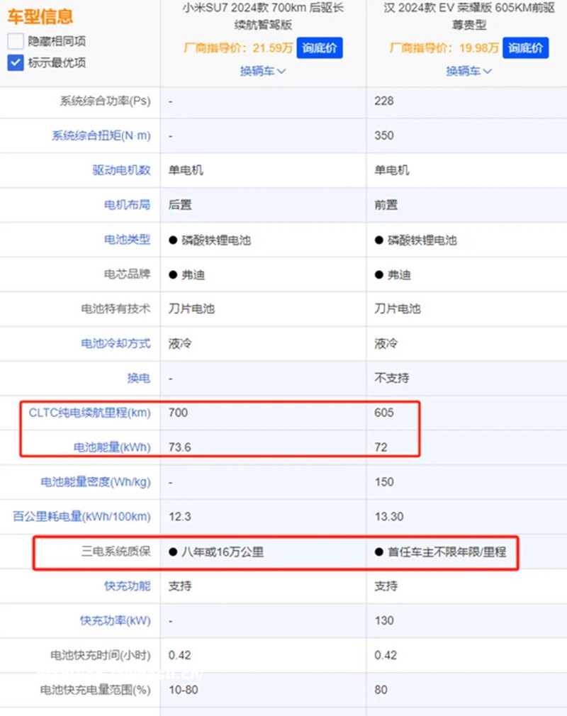 比如,对比同样搭载弗迪磷酸铁锂电池、电池能量只比小米SU7低配版少1.6kWh的比亚迪汉,CLTC续航里程只有605km,SU7的700km是否靠谱?