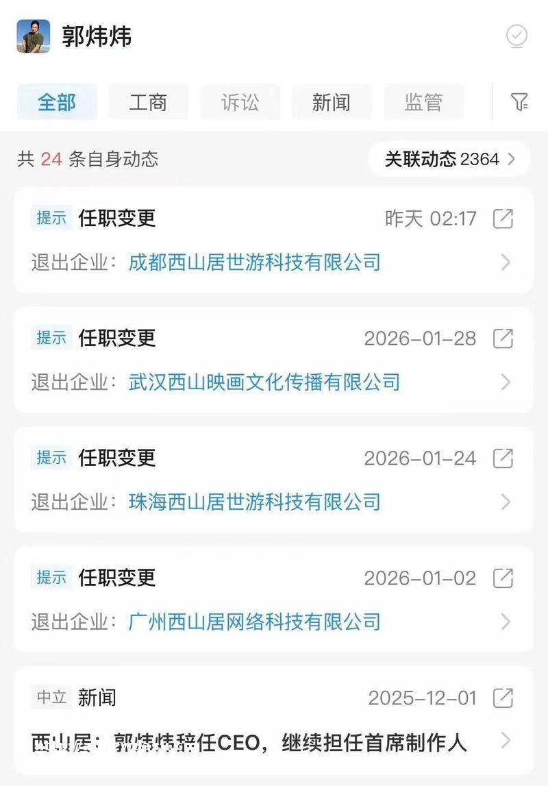 实际上,今年2月底以来,陆续还爆出郭炜炜已退出多家西山居关联公司的监事、董事等职务,包括成都西山居世游科技有限公司、武汉西山映画文化传播有限公司、珠海西山居世游科技有限公司以及广州西山居科技有限公司。