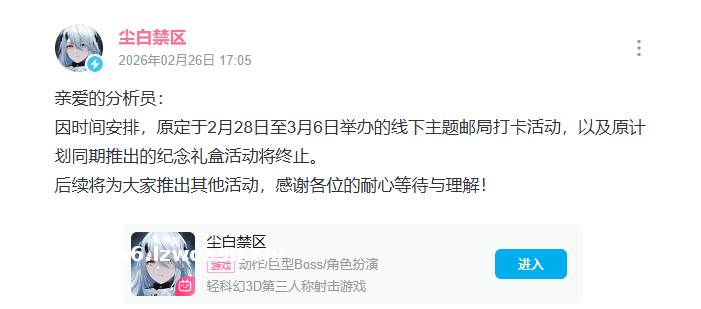 网友认为,中国邮政作为**公共品牌,为存在争议的游戏站台,易传递不良导向,对未成年人造成负面影响。2月26日,宣布终止线下活动及礼盒发售;次日,中国邮政内部人士证实相关活动已**,并辟谣“*****将印游戏内容”的传言,称联名产品仅为明信片等,*****均与校方定制,从未纳入商业联名元素。(详见报道《中国邮政称已**与尘白禁区的联名快闪》)