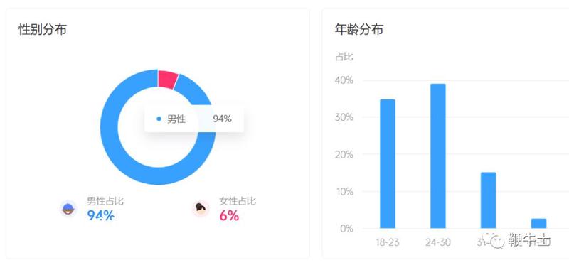 旭旭宝宝的粉丝画像显示,男粉丝占比高达94%,以 24-30岁居多,且集中分布在一线城市。其中40.2%为iPhone用户,消费能力不差。