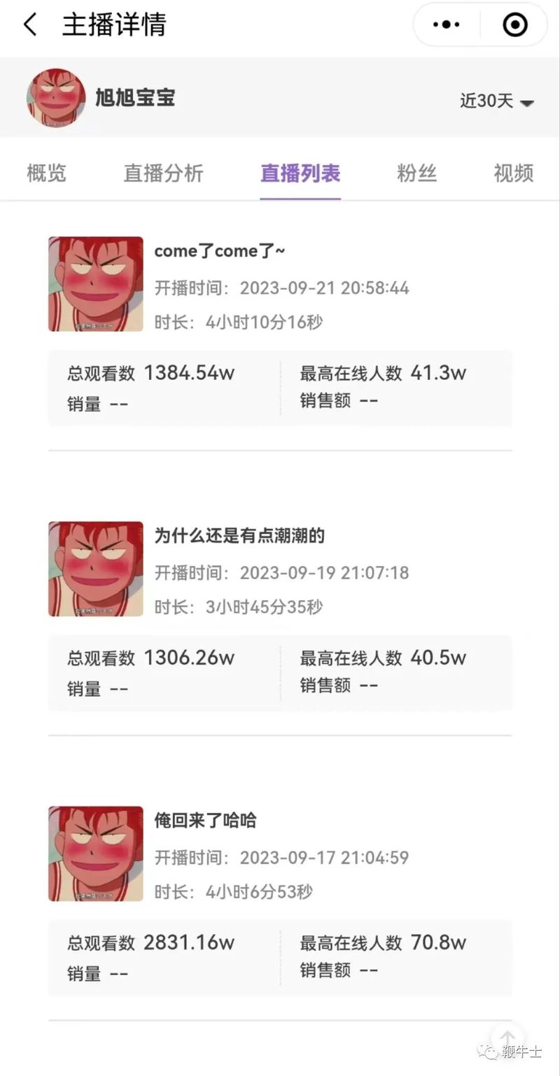 一个月过去了,目前旭旭宝宝粉丝从首秀前的300多万涨到了1513.9万,**间人气虽不比首秀,但每天晚上的**总观看数也能保持在1001-600万;****人数普遍在40-60万。