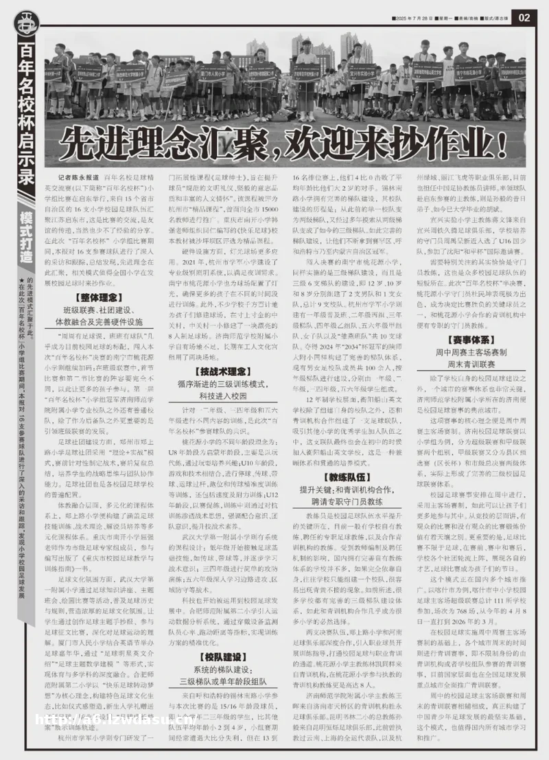 7月21日至7月27日,第二届“百年名校杯”小学组比赛在启东举行,来自15个省市自治区的16支小学队伍汇聚江苏启东市,这是比赛的交流,是友谊的传递,在此次“百年名校杯”小学组比赛期间,**理念在此汇聚,相关模式值得**小学在发展校园足球时来抄作业。