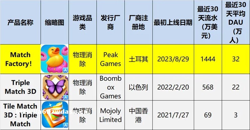 该厂商目前月流水**的产品「Tile Busters: Match 3 Tiles」(下面简称为「Tile Busters」)属于消除玩法里的物理消除子类,这一子类最头部的产品「Match Factory!」也由土耳其头部休闲厂商 Peak Games 开发,月流水已经突破 1400 万美元。