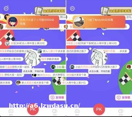 PK界面像是大型**现场,玩家可以在这里发送弹幕(一桌豆发一次,但每天可以免费发送3条弹幕),看到合眼缘的玩家可以点进对方主页,会显示相关的资料……另外在屏幕上方可以看到一些玩家之间送出的礼物,同样可以直接点进该玩家主页……