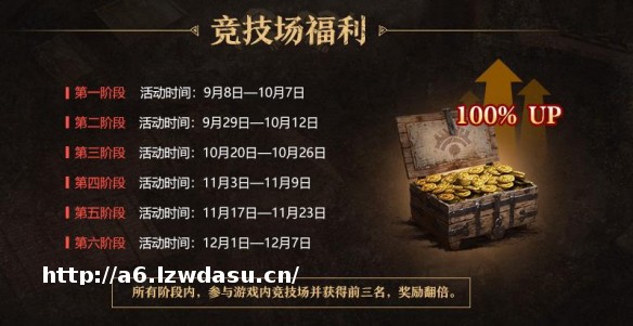 “竞技场福利”分为六个阶段,在每一阶段的活动开启期间,参与游戏内竞技场并获得前三名的玩家所获奖励翻倍。