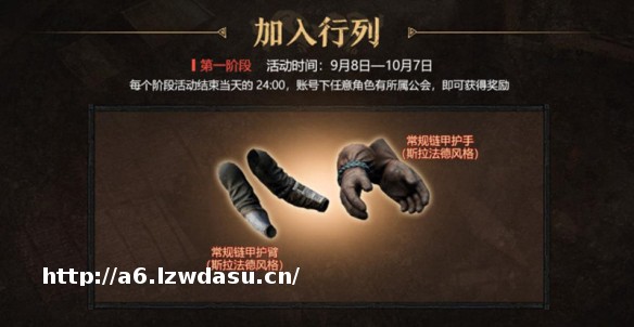 “加入行列”活动分为三个阶段,在每个阶段的活动结束当天的24:00,账号下任意角色有所属公会,将分别获得常规链甲护臂/护手(斯拉法德风格)、常规棉甲护臂/护手(斯拉法德风格)与半身板甲护臂/护手(哥特朗格风格)。