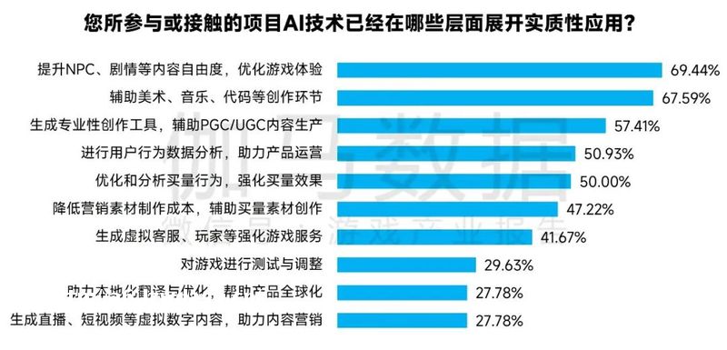 在面向游戏从业者的调研中,“提升NPC、剧情等内容自由度”和“辅助美术、音乐、代码等创作”占比接近七成,用于“生成专业*创作工具,辅助PGC/UGC内容生产”占比接近六成,