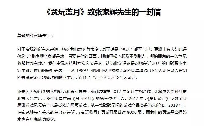 贪玩游戏马上迎来三周年庆典,一般游戏公司的操作可能是写给玩家一封真挚的感谢信,但贪玩却不走寻常路。5月25日晚,贪玩给曾经的代言人张家辉写了《贪玩蓝月致张家辉的一封信》,文章也中提到,我们也会不忘初心,永远会像“初恋”一样对待张家辉先生。