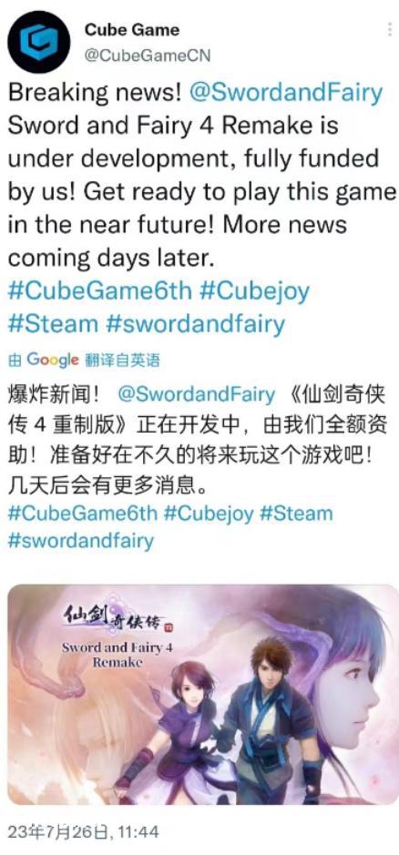 方块游戏在推特上表示全额资助《仙剑4重制版》,增加新的情节,并将推出英文版