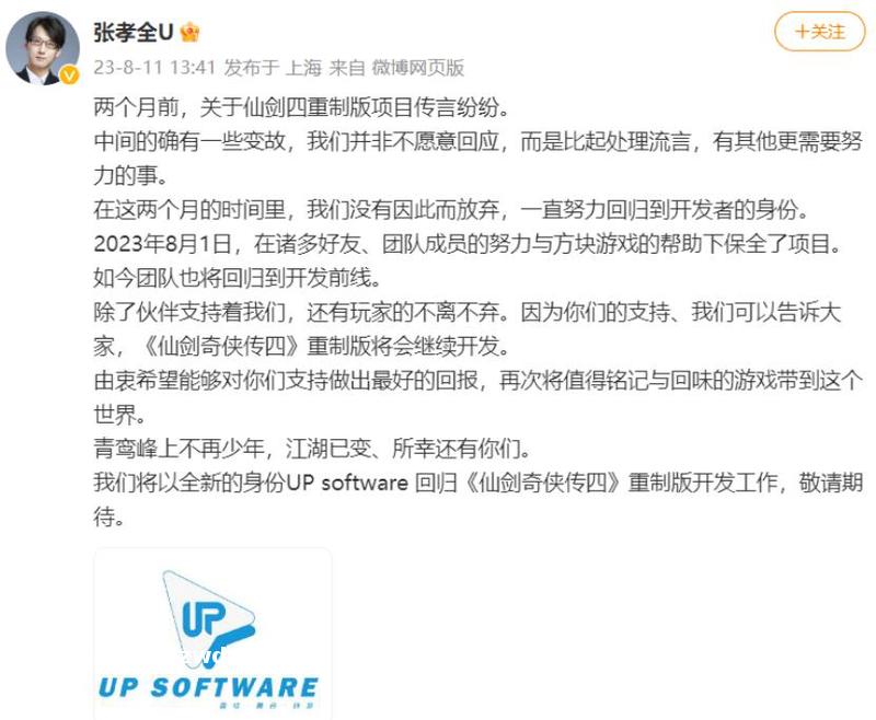 7月18日,原上海软星总经理张孝全,在微*上正式回应了过去两个月关于《仙剑4重制版》的传闻,张孝全承认经历了一些变故,但他们没有放弃,一直努力回归到开发者的身份,直到9月8日才在诸多好友、团队成员的努力与方块游戏的帮助下保全了项目。但值得注意的是,张孝全强调“我们将以全新的身份UP software回归《仙剑奇侠传四》重制版开发工作”,并附上一张全新的名为“UP software”的logo图案。