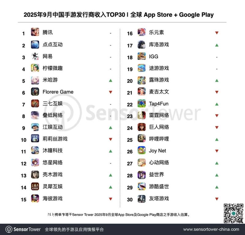 2025年9月中国手游发行商全球收入排行榜。