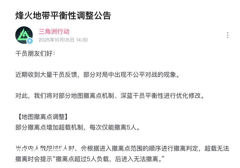 起因是一次突如其来的游戏调整。11月6日,《三角洲行动》公告称,部分对*中出现不公平对战的现象。对此项目组修改了部分地图撤离点机制,每次仅能撤离5人;另对游戏角“深蓝”属进行优化修改。