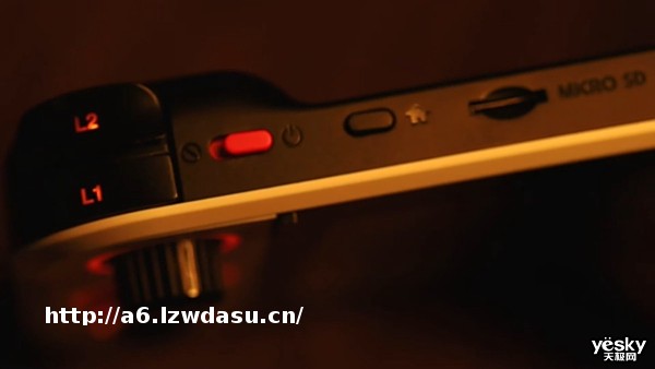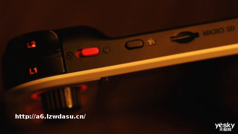 机身上方的L1、L2、R1、R2按键也都做了背光处理,L1L2肩键旁边是电源按键、Home键以及MicroSD卡卡槽;机身顶部还给到了HDMI接口和3.5mm音频接口,不过不清楚HDMI接口的规格。