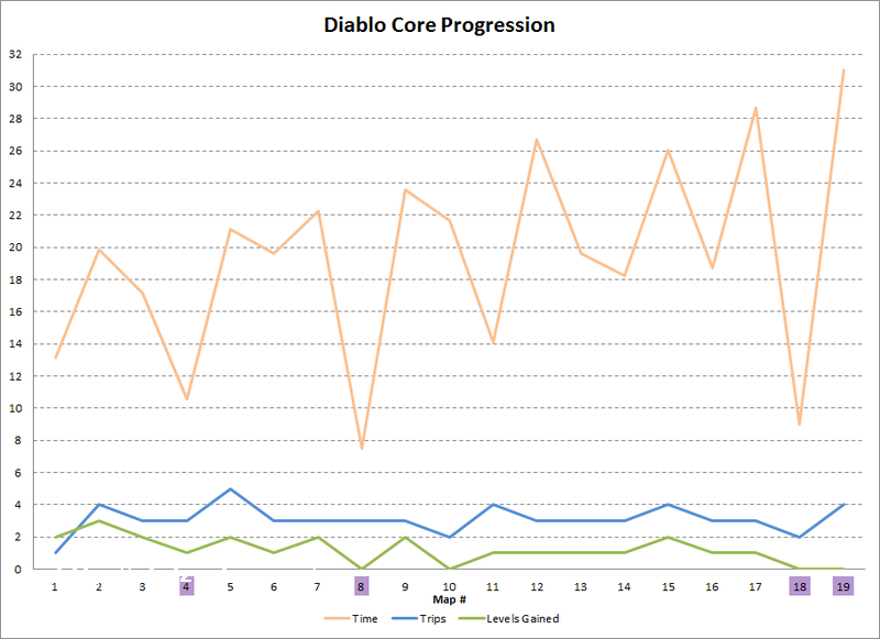 下面的图表是按时间与地下城关系来绘制的(以分钟为单位),显示了每层花了多少时间来消灭所有的敌人,拿起所有的战利品,以及每层我的战士获得了多少经验。