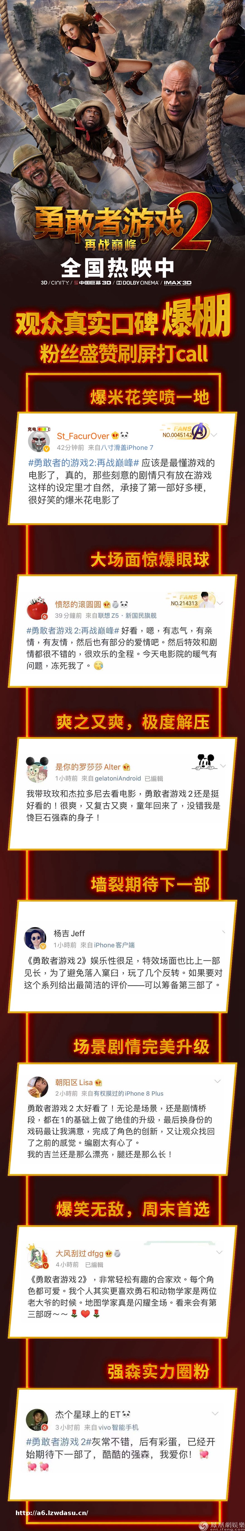 同时,**映后收获媒体、大V一致推荐,首周末获得无数观众好评,被称之为“解压利器”:“又复古又爽,童年回来了”;全面升级精彩好看:“无论是场景,还是剧情桥段,都在1的基础上做了**的升级,最后换身份的戏码最让我满意,又让观众找回了之前的感觉,编剧太有心了”;爆笑无敌周末**:“非常轻松有趣的合家欢,每个角色都可爱”;很多观众被强森吸粉:“酷酷的强森,我爱你!”“没错,我是馋巨石强森的身子!”很多观众对下一部表示强烈期待:“如果要对这个系列给出最简洁的评价——可以筹备第三部了”“非常不错,后有**,已经开始期待下一部了”。