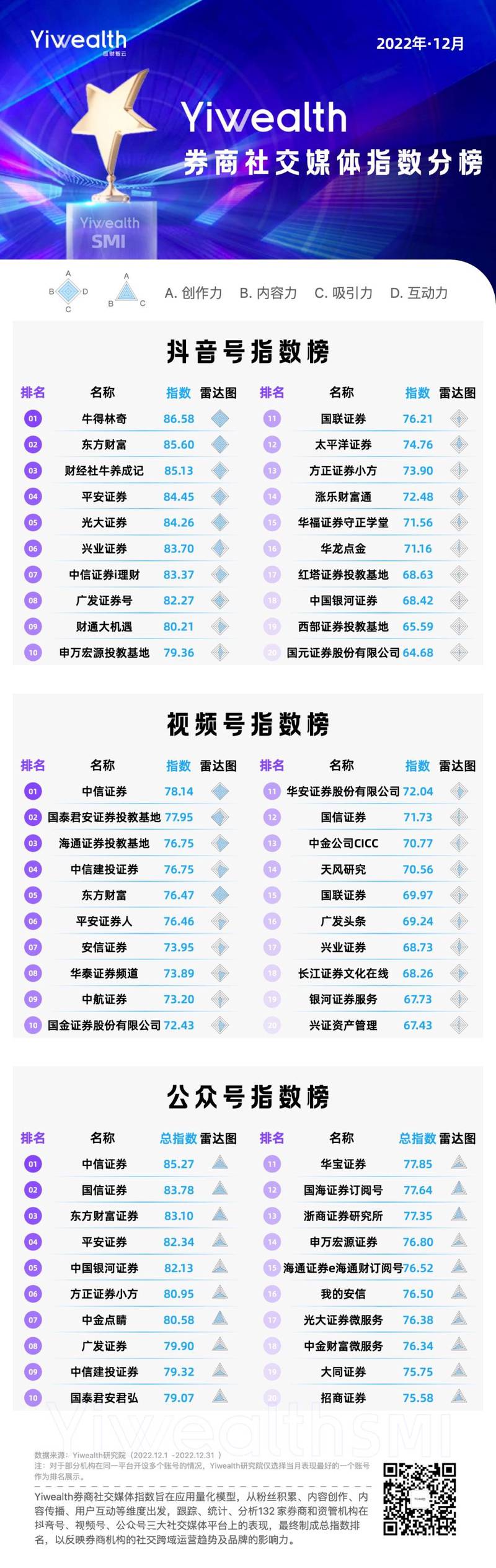 为反映券商、**、**、保险等**机构的社交媒体运营趋势,应帆科技(**财经成员企业)旗下**信息智能运营服务商Yiwealth(应财智云)自2022年起每月发布**机构社交媒体指数(Yiwealth Social Media Index,简称Yiwealth I)。 本期为券商社交媒体指数(2023年2月),以反映其跨域运营趋势及品牌影响力。