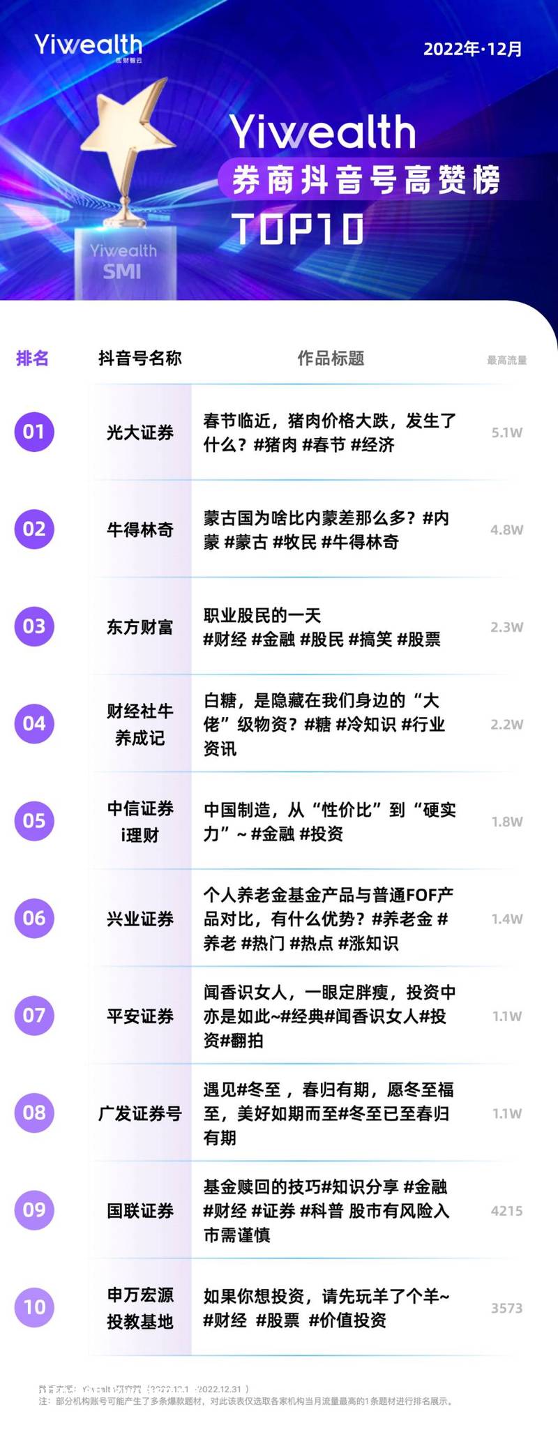 为此,Yiwealth研究院盘点了10月券商**短视频的热点内容发现,获得了较高的传播声量。