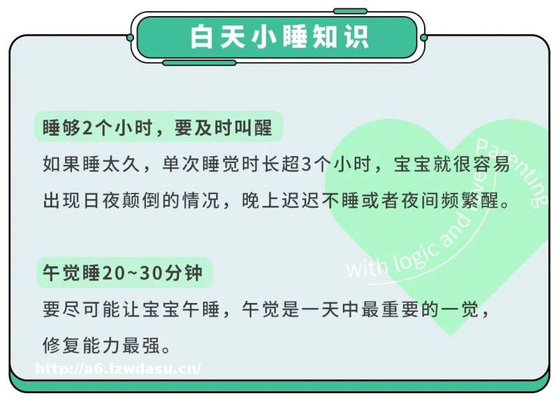 6个月前,白天保证有两次长度在1~2小时的小长觉;6个月后,白天至少保证有一次长度在1.5~2.5小时的小长觉。