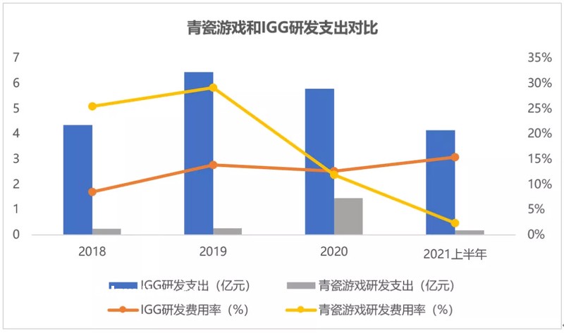 单从**投入来看,两家公司的选择截然相反,IGG继续加大**投入,而青瓷游戏**投入反而出现了缩减的迹象。2021年上半年,青瓷游戏**投入仅1800万元,金额还不及2018和2019年。