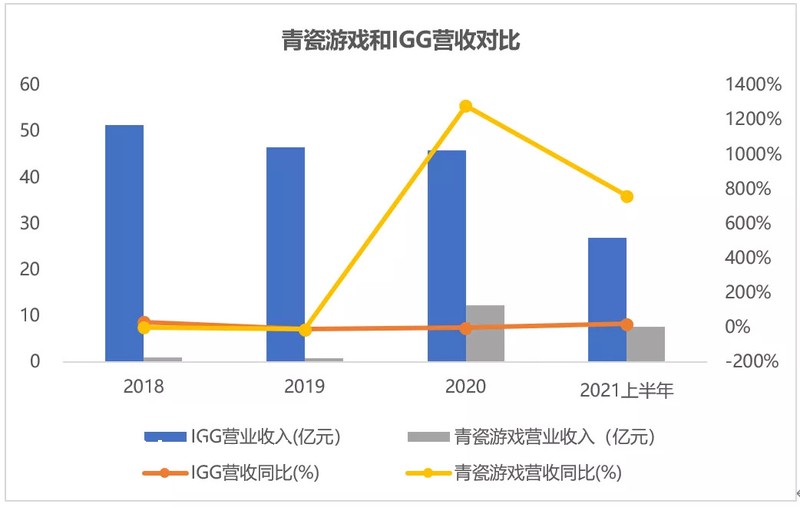 从营收体量来看,2018年IGG营收(7.49亿美元,约51.4亿元)是青瓷游戏(0.98亿元)的50倍以上,到了2021年上半年,IGG 营收(4.17亿美元,约26.94亿元)不过青瓷游戏(7.63亿元)的3倍多。