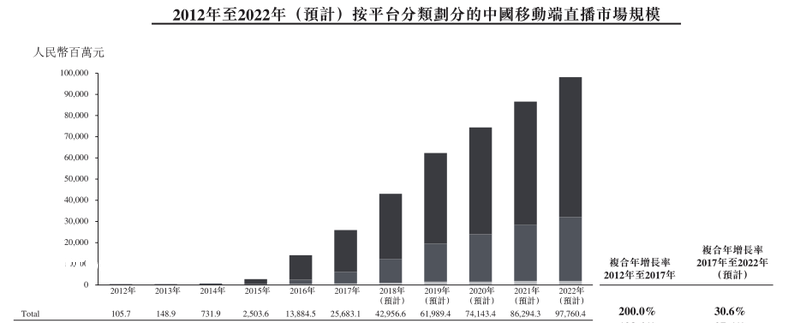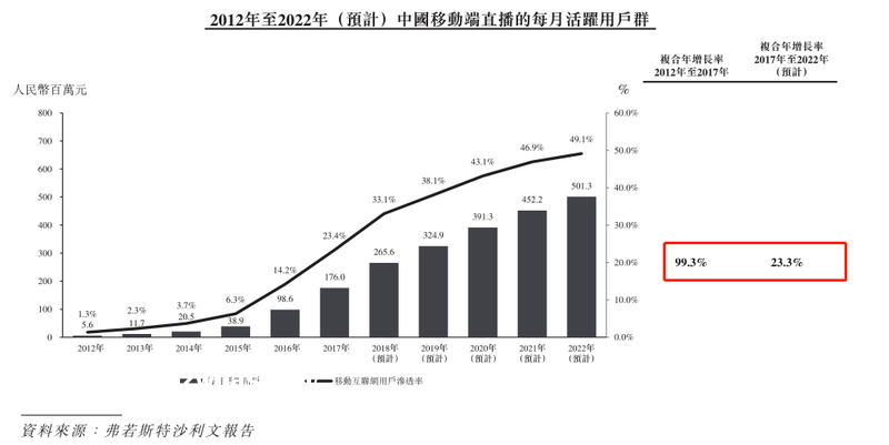 中国移动端**的每月活跃用户群从2012年的560万人增加至2017年4.76亿人,复合年增长率为99.3%,2022年将经一部增加至5.01亿人,复合年增长率为23.3%。